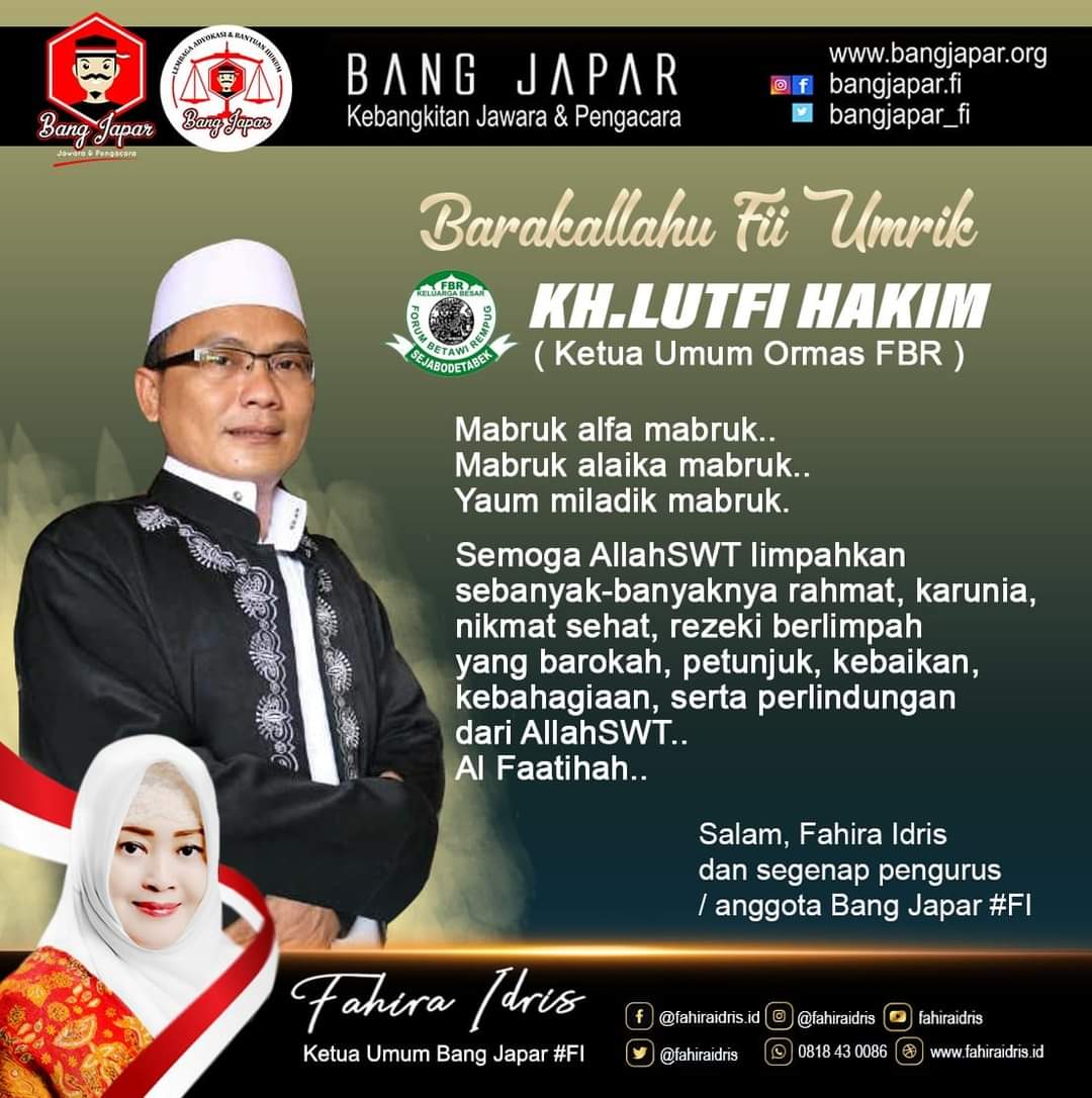 Jakarta – Fahira Idris Anggota DPD RI Dapil Provinsi DKI Jakarta yang juga Ketua Umum Bang Japar hari ini mendoakan khusus dan mengucapkan Milad kepada Ketua Umum FBR KH. Lutfi Hakim,MA yang hari ini 5 November 2021 berulang tahun.