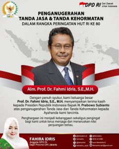 Dengan penuh rasa syukur, kami keluarga besar Prof. Dr. H. Fahmi Idris, S.E., M.H., menyampaikan ucapan terima kasih yang sebesar-besarnya kepada Presiden Republik Indonesia, Bp. H. Prabowo Subianto, atas Penganugerahan Tanda Jasa & Tanda Kehormatan dalam rangka Peringatan Hari Ulang Tahun ke-80 Kemerdekaan Republik Indonesia kepada Alm. Ayahanda kami tercinta, di Istana Negara, 25 Agustus 2025.