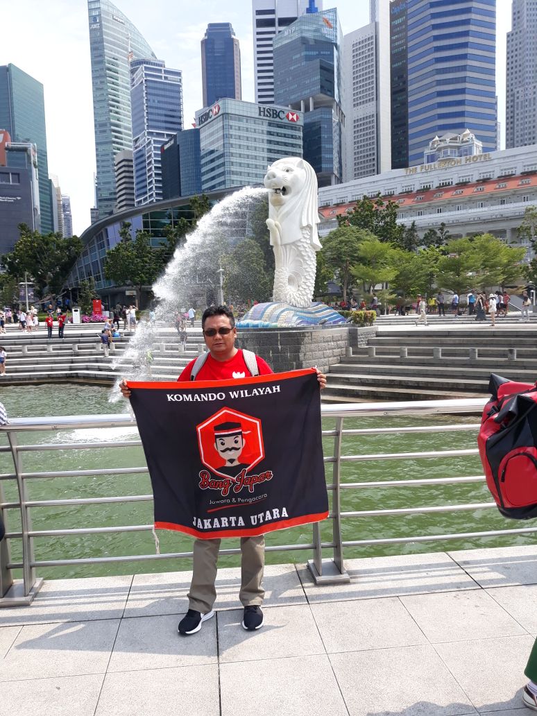 Anggota Bang Japar Jakarta Utara mengabadikan Bendera Bang Japar di Singapore